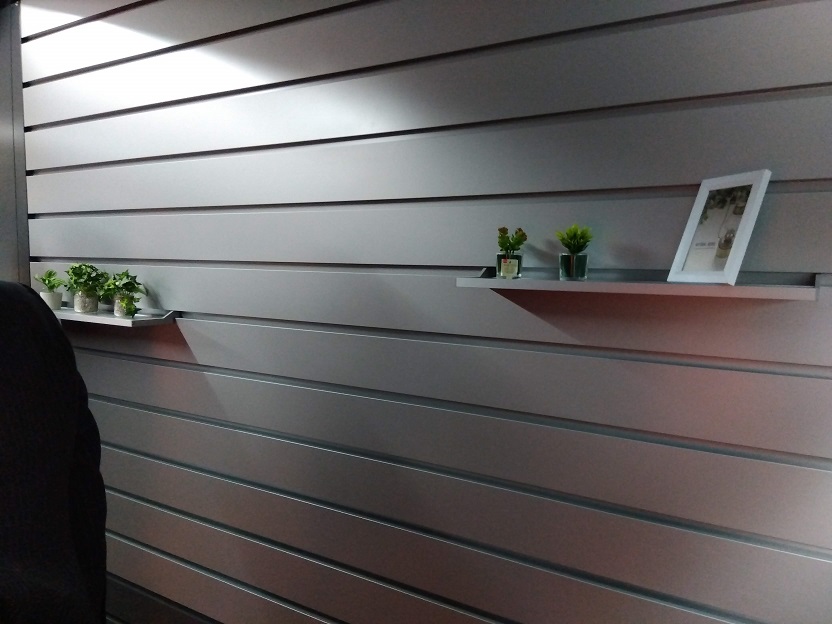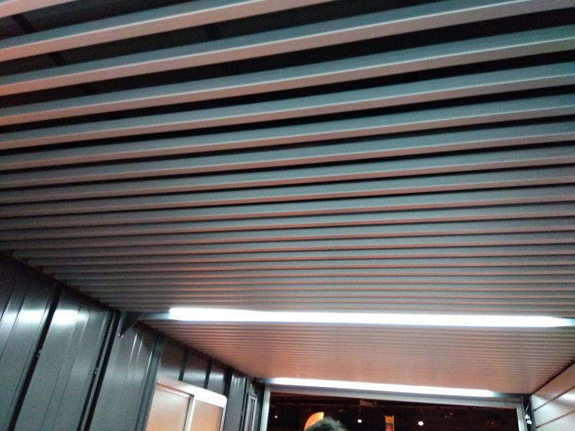 天井をルーバー材で覆ったり、壁のパネルをすっきりした見た目にしたりと