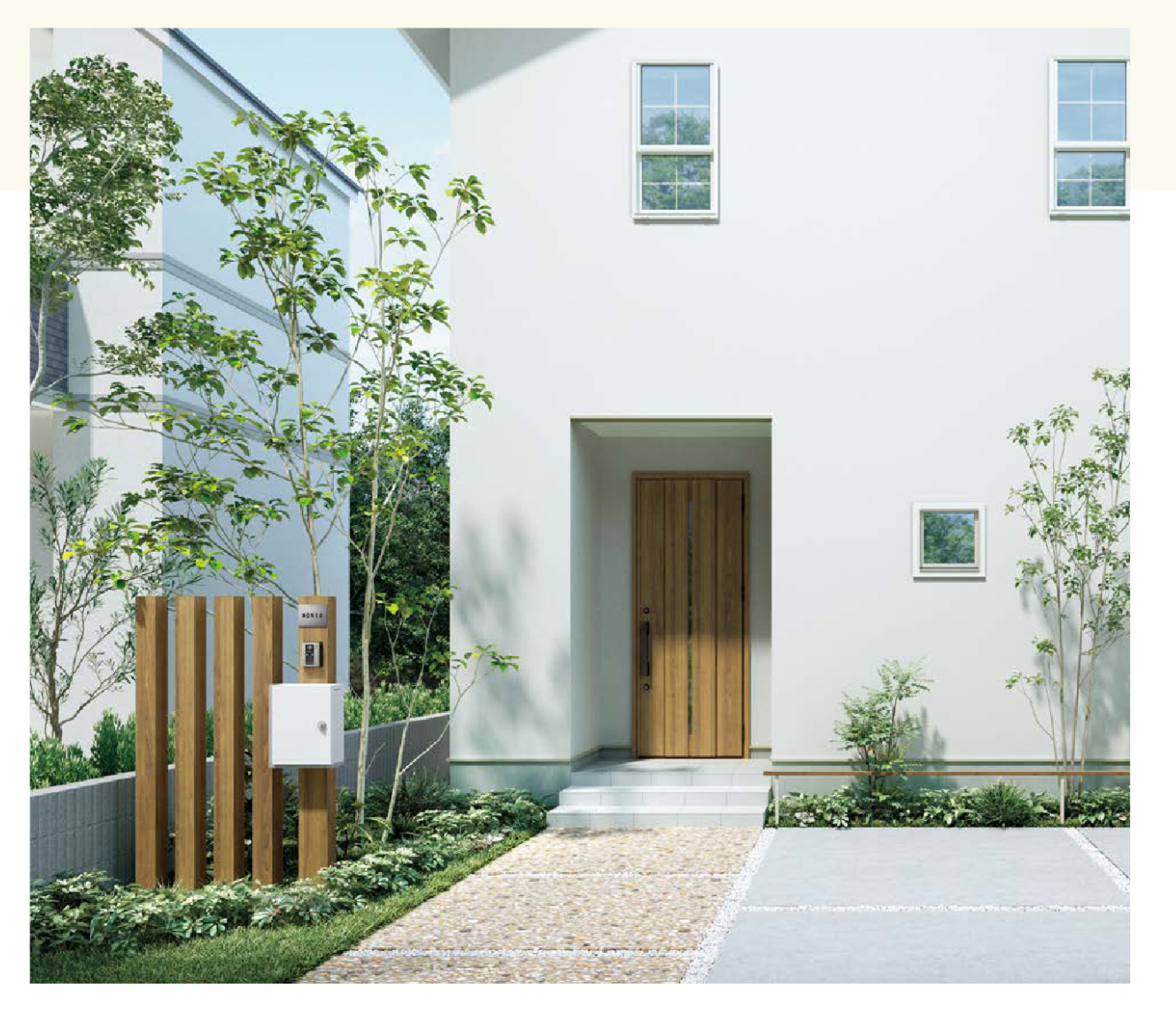 ▼反対に機能門柱FWは、木目調のぬくもりある色合いでナチュラルスタイルの外構にピッタリです。