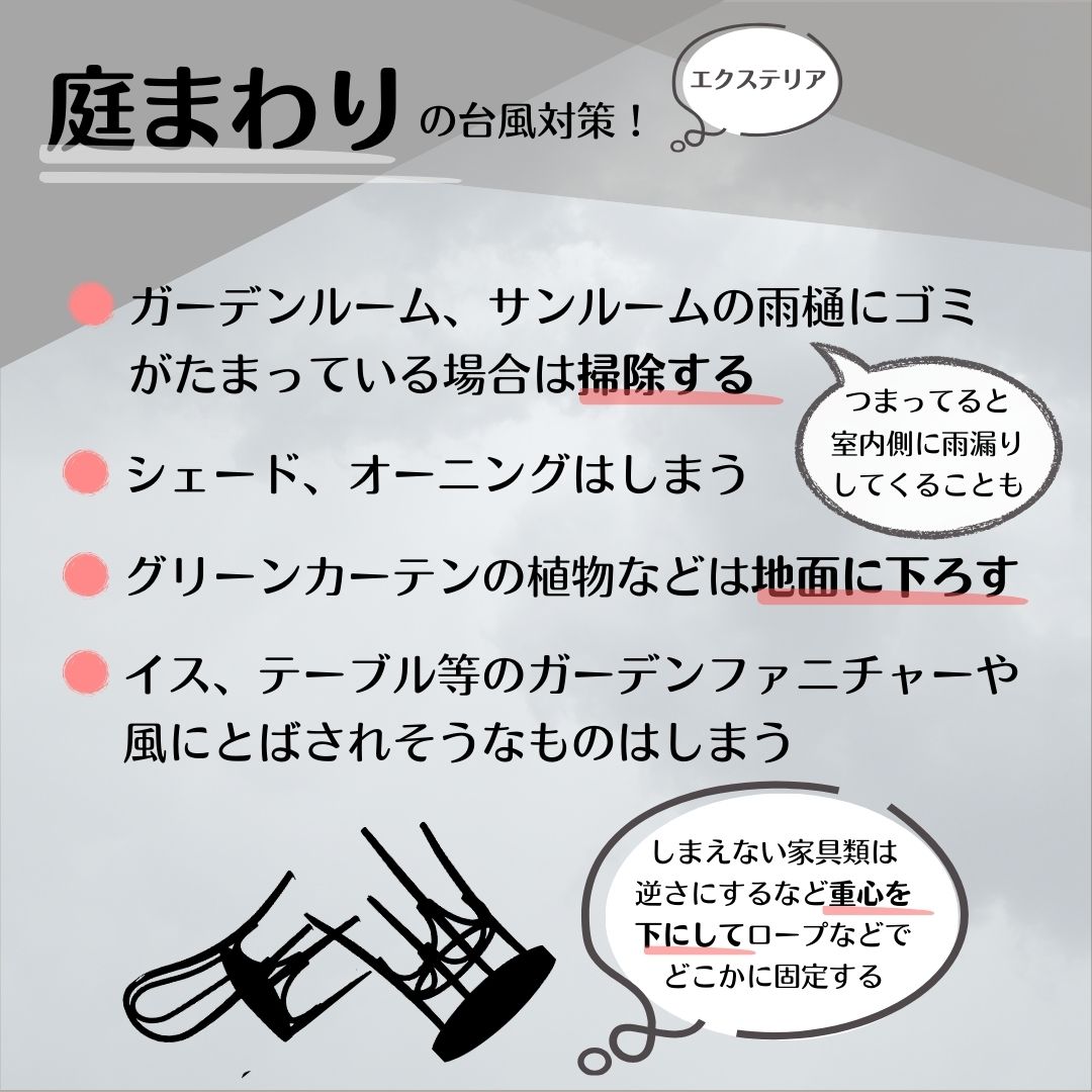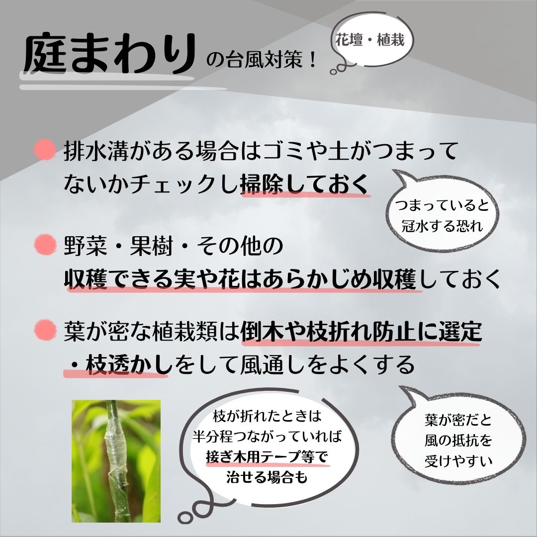 まさに台風10号の北上が連日報道されるさなかですが、今回は庭をふくめお家のまわりでできる台風対策をまとめました。