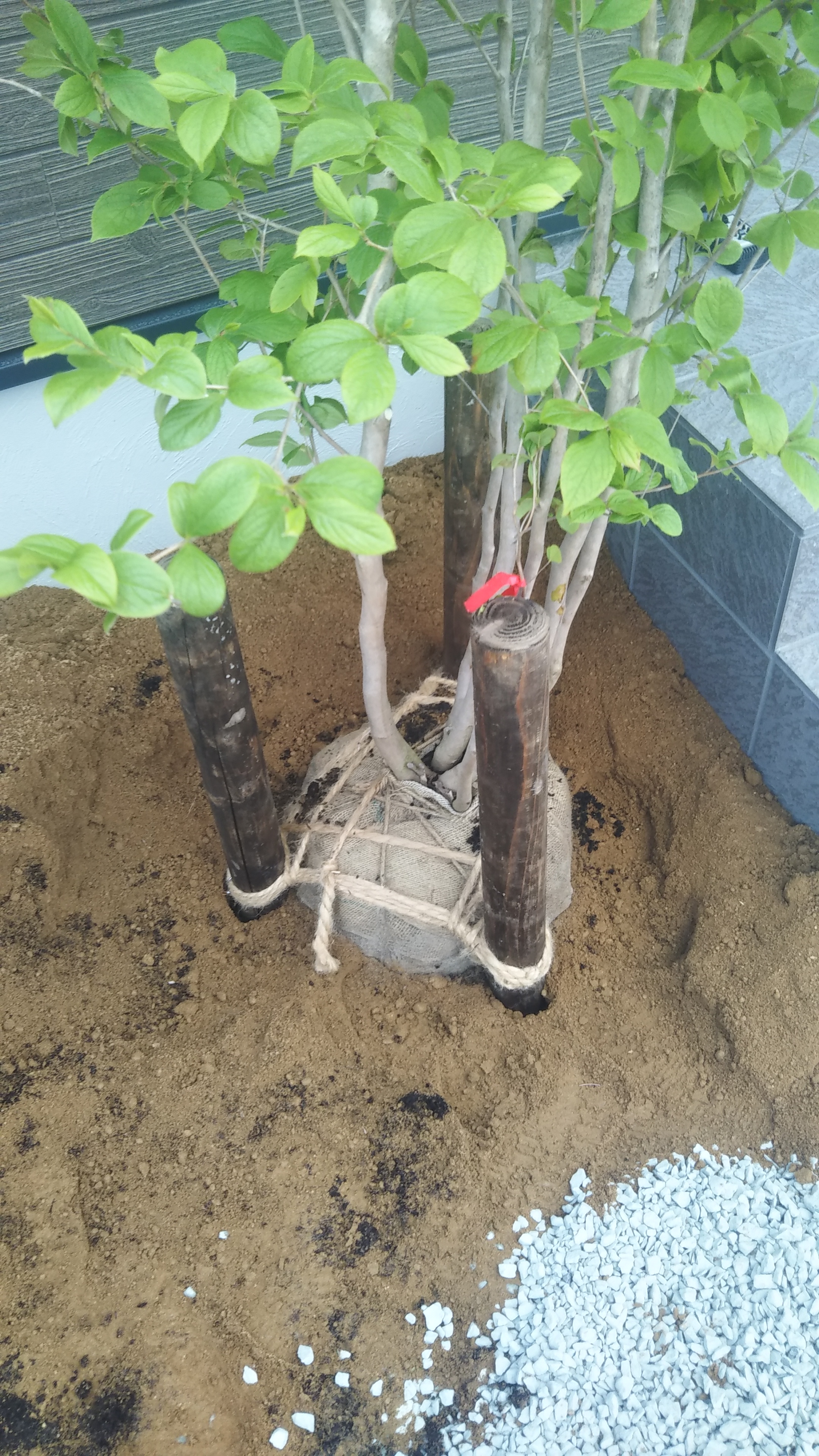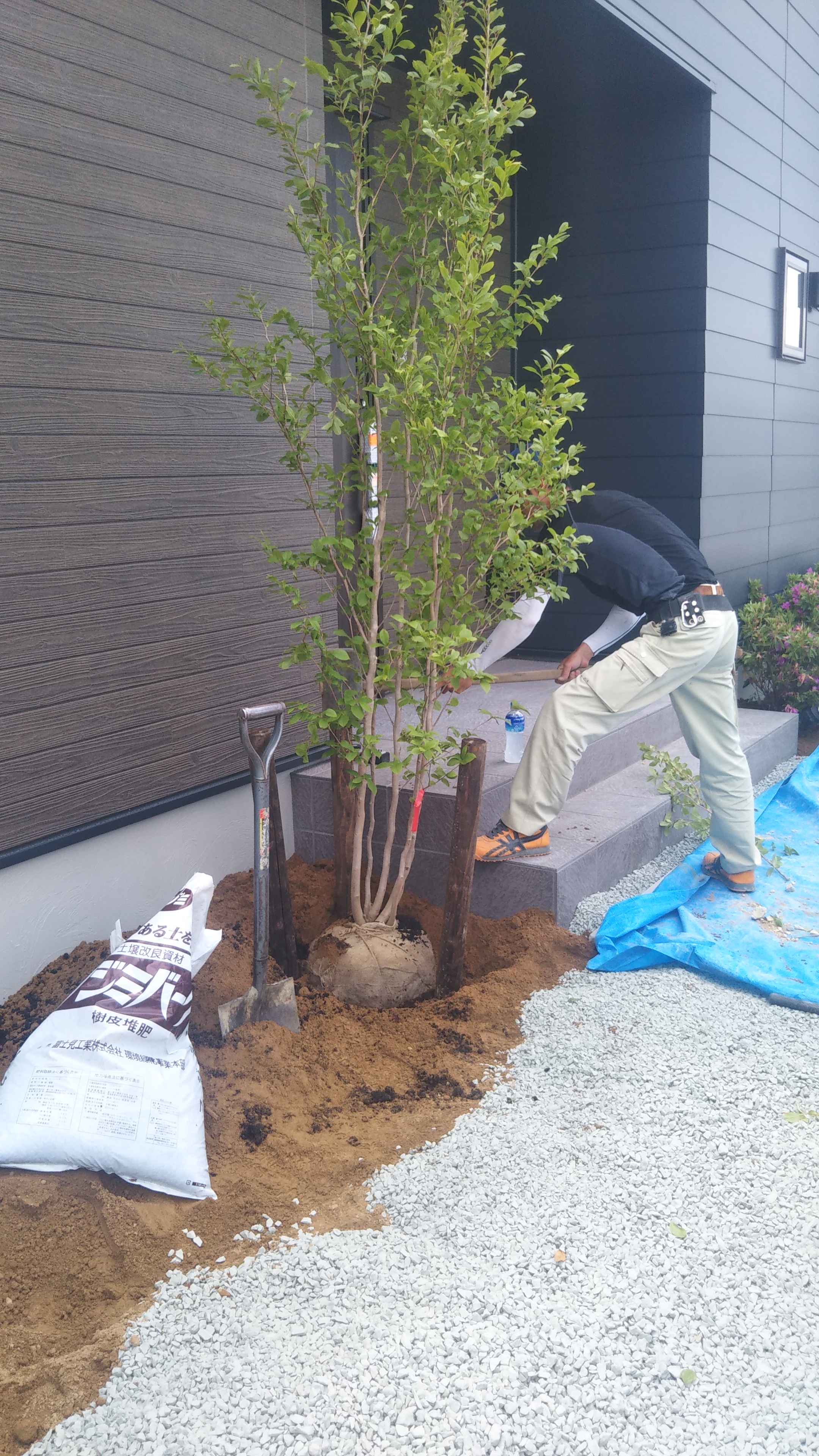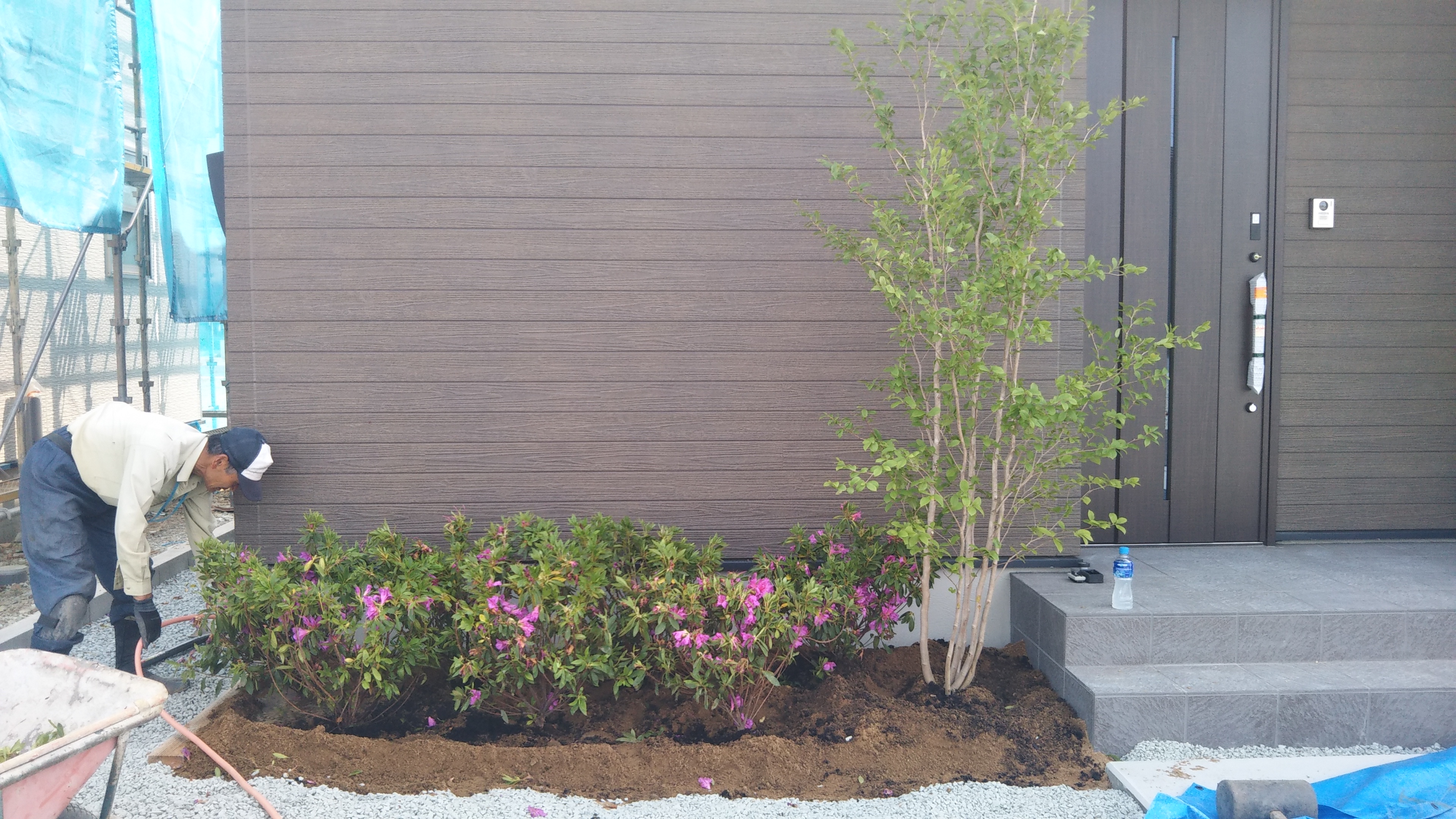 玄関前にシンボルツリーのシャラとオオムラサキツツジを植えます