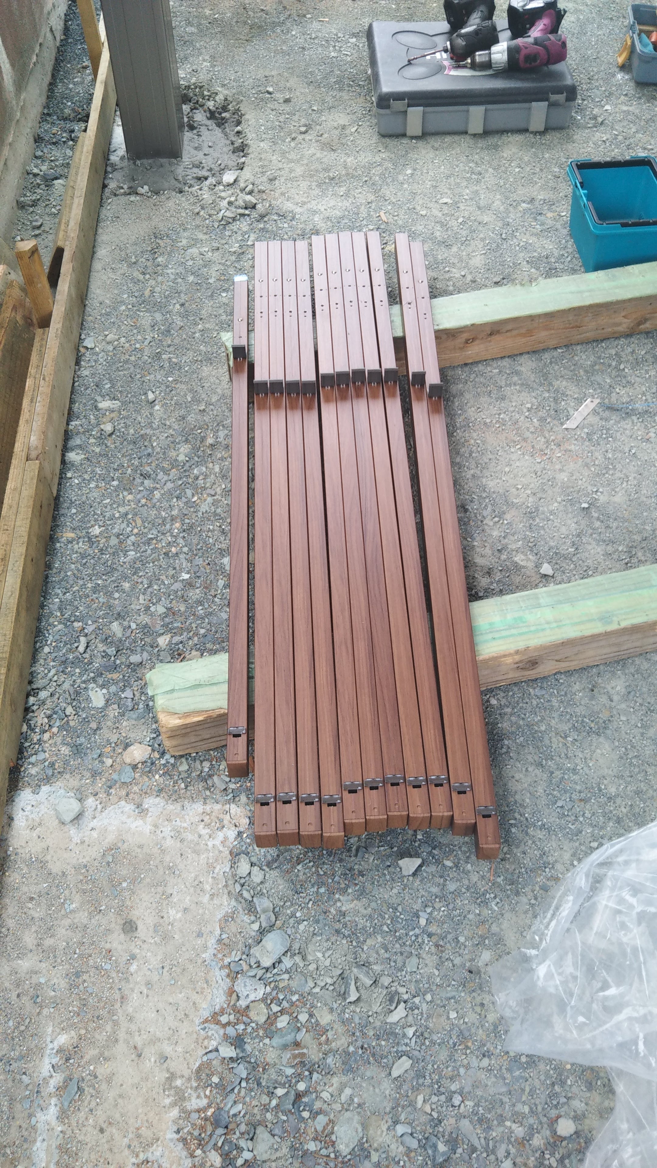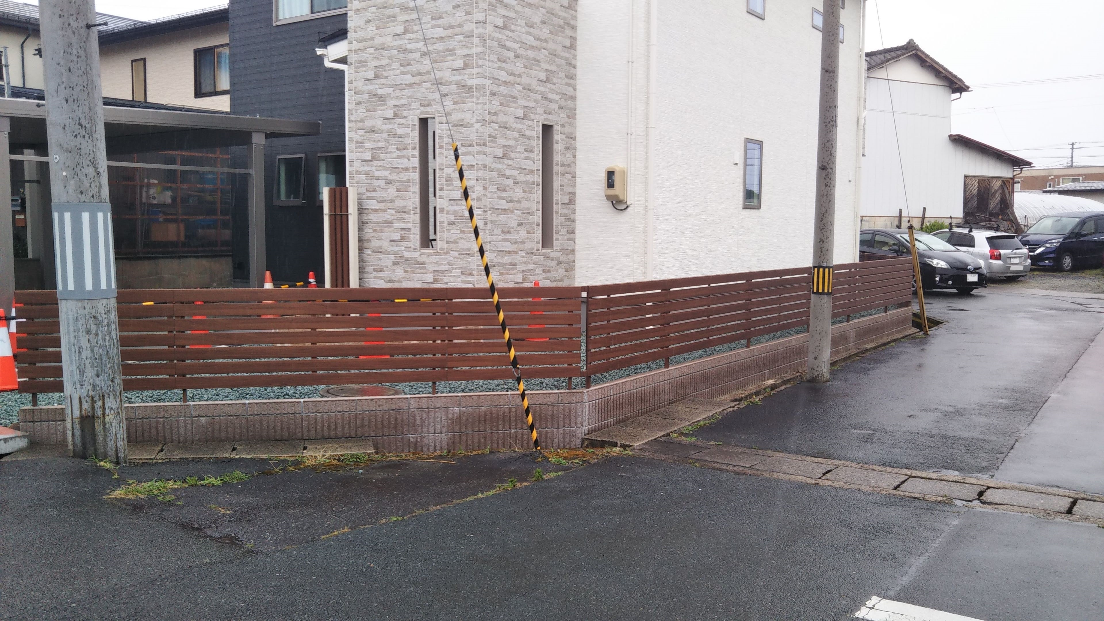 ブロックの上に木目調のアルミ形材フェンスを設置します。