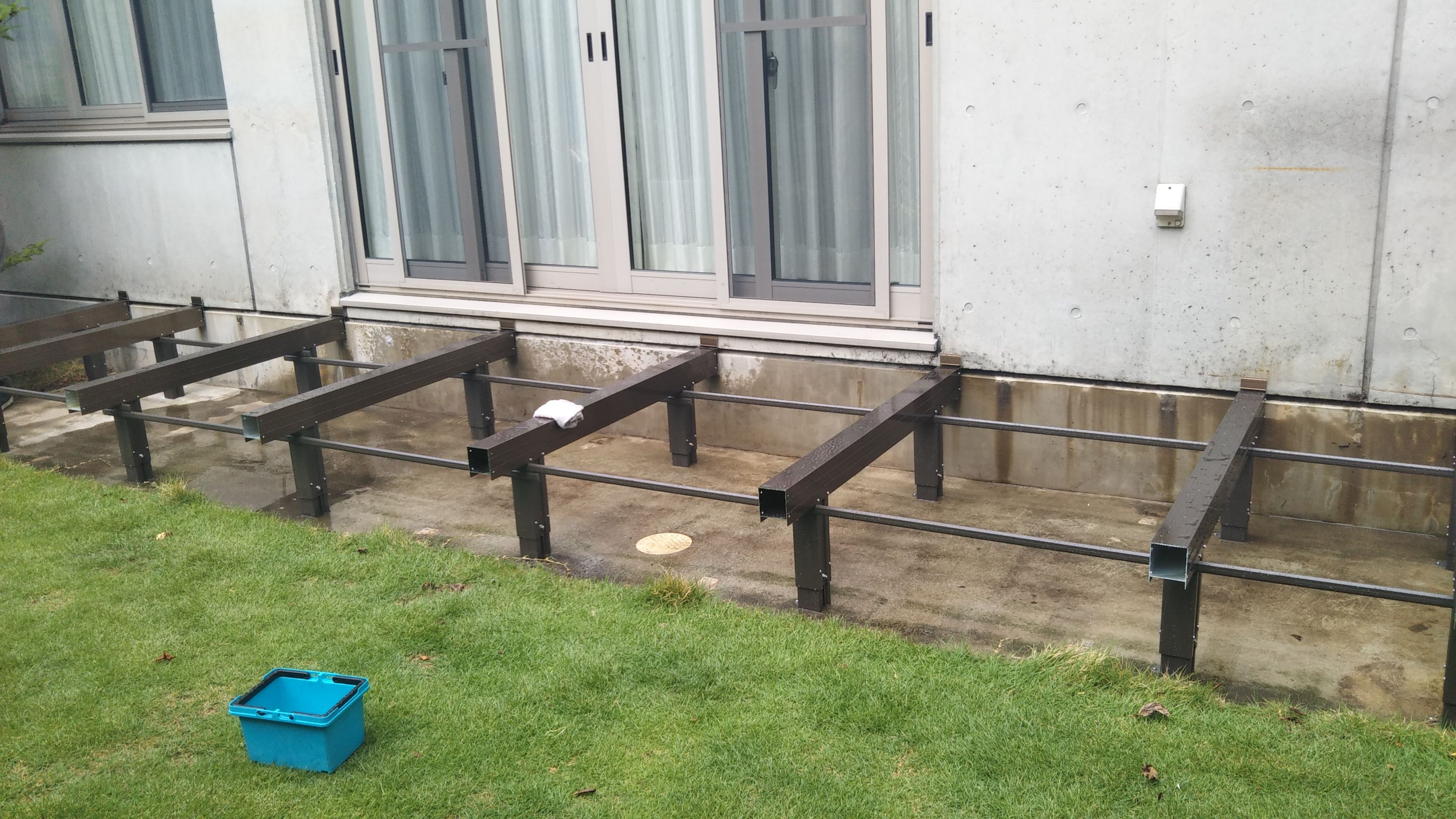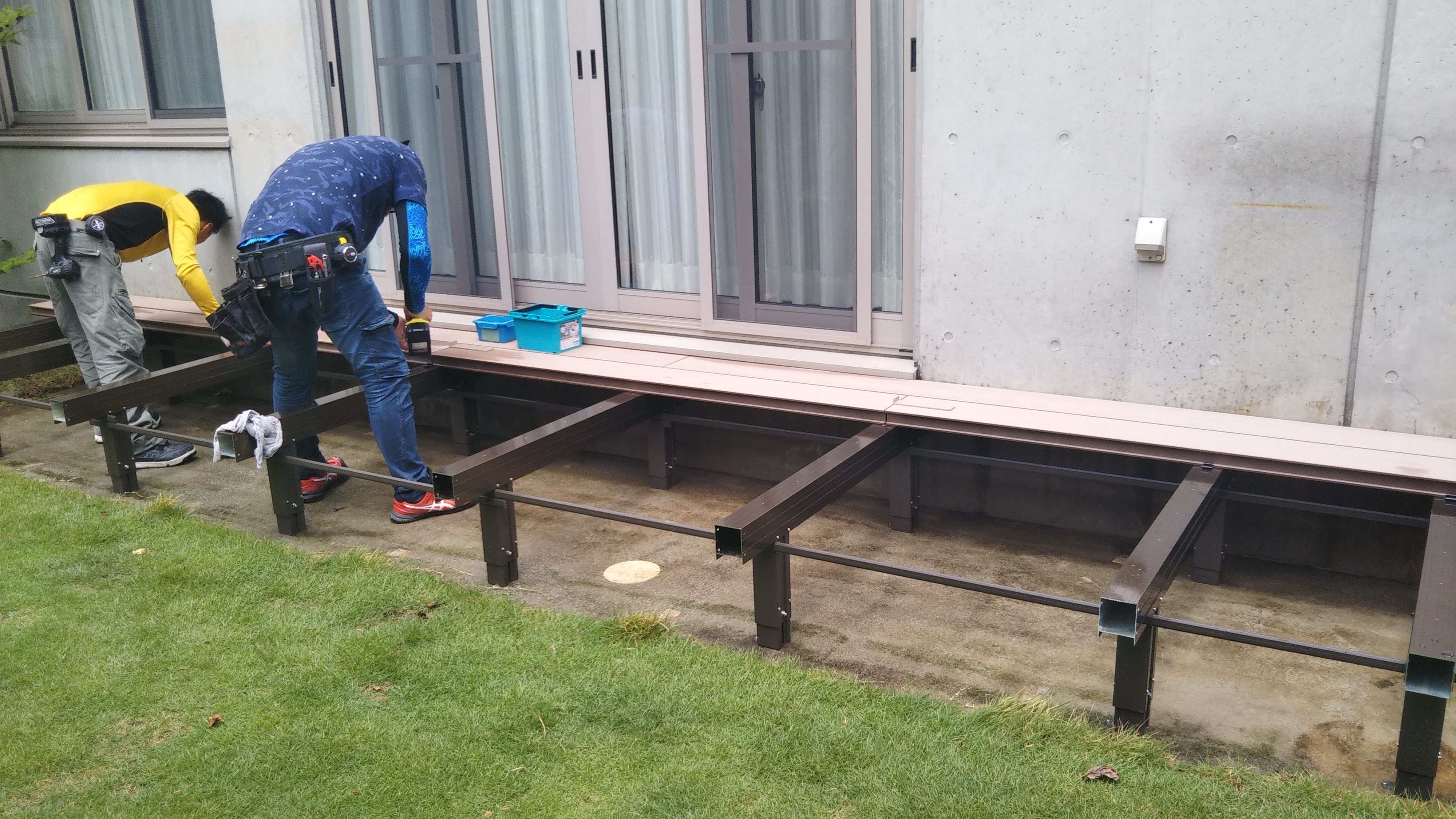 アルミの大引と束柱で足を組んだ上に、1枚ずつデッキ板を固定していきます。今回の製品は敷地の傾斜に合わせて柱を伸縮できるので、水平にデッキを組むことができます。